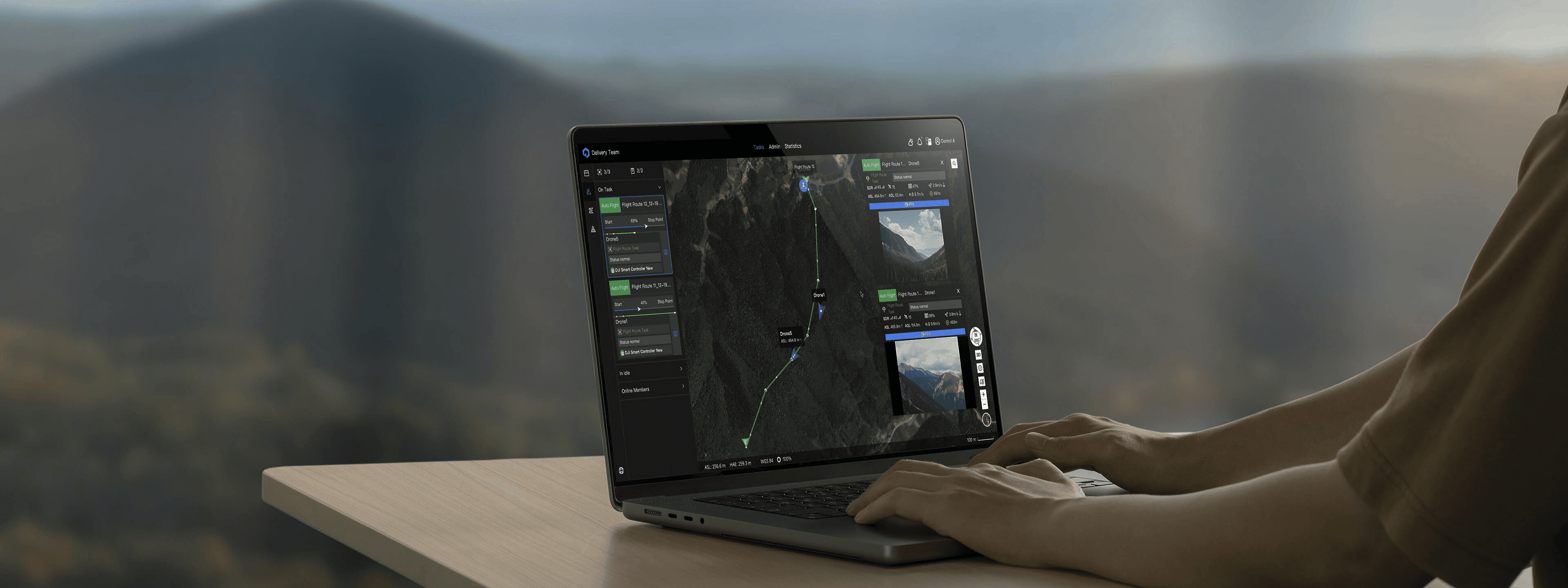 View the position, status, and flight routes of drones in real time on a 2.5D Base Map[1] which displays global elevation data. View the live feed directly from the drone's high resolution FPV gimbal camera.