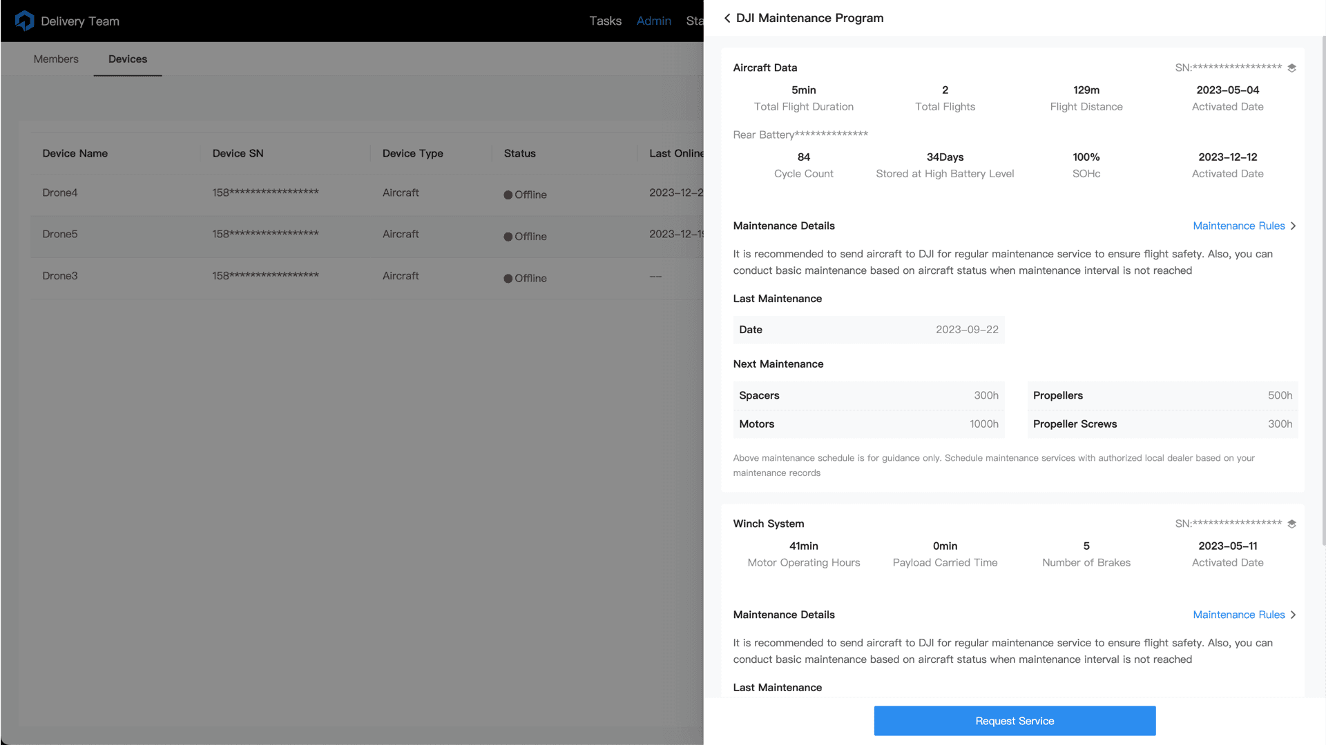 Monitor and manage fleet health status, maintenance information, and DJI Care status.